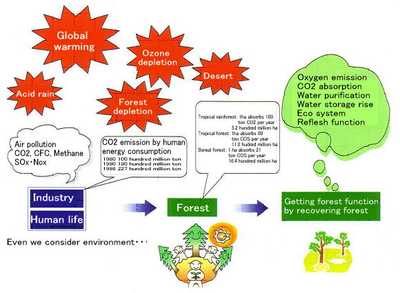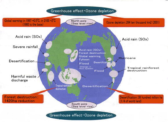 The Earth temperature is determined by the balance between in and out energy. Current temperature increase is mainly due to lose the balance by increase of CO2.CO2 is discharged by igniting fossil fuels and has characteristic that absorb the heat from the earth, so that it is called greenhouse effect gas. There are other gasses which have same effects, such as methane, flon, and nitrous oxide. After 1980, average temperature in the earth has rapidly increased. There are several phenomenon such as heat wave and drought occurred due to global warming. Because of increase the temperature of ocean water, the level of ocean rose up. As a result salt water goes into underground water and rivers. The decrease of rain water causes desertification so that the agriculture is destroyed in the world. Global warming causes the lack of food in the world seriously. he factors of destroying ozone layer are artificial chemical substances such as flon and halon which had been used in refrigerator and sprays. When these matters rise up, chlorine atoms are produced by reaction with strong ultraviolet rays. Chlorine atoms take oxygen atoms from ozone, and a ten thousand ozone are destroyed by the one atom. Ozone exists at a height of 20 km and makes ozone layer. Ozone absorbs ultraviolet rays from the Sun. Ultraviolet rays causes skin cancer, cataract, and genetic defect. Ozone layer which absorbs ultraviolet rays has been destroyed. The factor of deforestation is the uncontrolled use of the area to industrial tree felling and agriculture. Igniting fossil fuels produces nitrogen oxide and sulphur oxide and these substances are changed nitrate ion and sulphate ion which leads acid rain. Acid rain destroys forests. Deforestation causes not only the extermination of living things but also decrease CO2 absorption, thus speeding up global warming. Tropical forest destruction also speed up. If it lasts this situation, it reports that all tropical forests will be destructed by 2030. In the mid of 1980, there are 19 hundred million ha tropical forest. In every year, 1420 ten thousands ha are cut and changed to agricultural fields every year. Forestation is only 1 hundred thousands, and it is just 1/10 of decrease area. The factors of desertification are excessive farming, overgrazing, and overcutting. On the background, there is population growth. To obtain enough food resource, lands are used endlessly thus desertification occurred. That causes more lack of food so that leads negative cycle. Every year, 600 ha desertify. There are also 21 million ha agricultural area decreases its productive ability. The agricultural productive ability decreases in the area where desertification progresses. Thus, there is serious issue of starvation and lack of nutrient.