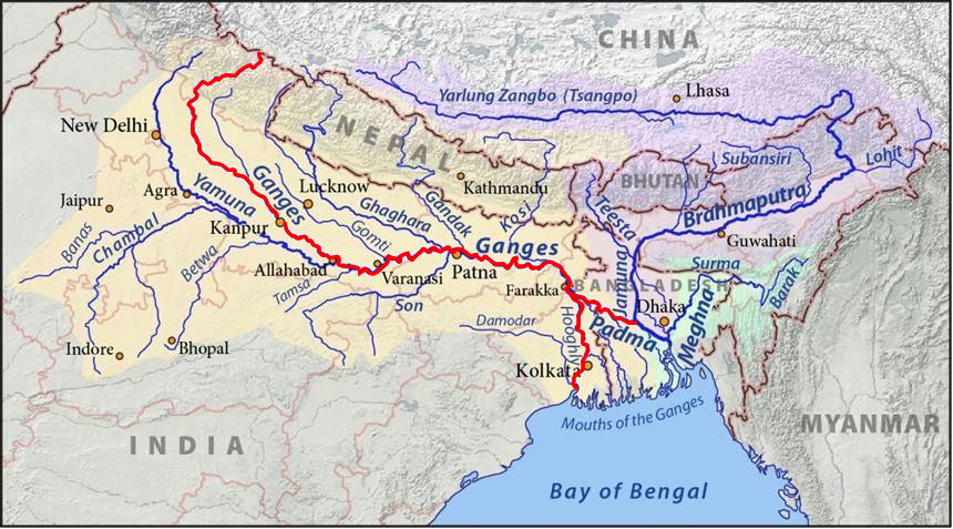 根据地域的不同,出水管和下水管被安装在一起,由于两个管道的破裂,污水甚至会混入自来水中。 几年前,首都新德里的水务部门检查了每个家庭的水龙头流出的自来水,检测到约20%的细菌,被污染的自来水可以感染霍乱和伤寒的不卫生的现状。 ■ 恒河 流经印度北部的恒河全长约2500公里,是一条发源于喜马拉雅山,且支流多、流域面积广的大河。 对占据绝大多数印度人的印度教徒来说,它被尊称为“神圣的河流”。据说是起源于一个传说故事,恒河原为流入天界的河流,但经人们的祈祷流到了地面。恒河水流湍急、汹涌澎湃,为了避免毁灭良田,残害生灵,所以湿婆神帮助驯服了恒河,为人类造福。 近年来随着城市人口的增多,污染也日益严重。