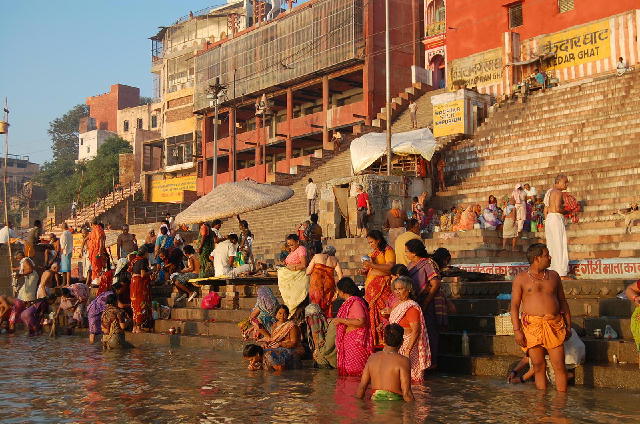 ● 在印度生活的人们沐浴的地方 因为印度教徒认为恒河的水能够涤罪攘祸,所以有在这条河里沐浴(用水洗身体)的风俗。 在恒河有名叫加特的大石阶,通过石阶慢慢进入恒河,男人会穿腰衣,女人则经常穿着纱丽沐浴。