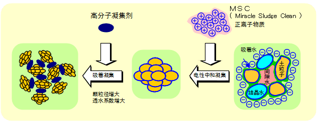 MSC作为疏水化脱水处理、土质改良剂,不仅可以早期完成疏浚底泥的沉降、压密,又可同时清净分离水。底质污泥的构造是由大小不同颗粒的土粒组成的矿物粒子集合体,粒之间的间隙部分充满着水和空气,这个土粒子通常带有负电荷。在这里,如果添加MSC、会使带正离子物质的MSC和具有的负电荷的土粒子在电性上进行中和。这时,相互结合的土粒子的毛管水被割开,间隙水、吸着水膜成为自由水,根据疏水化现象,土粒子之间相互吸附变成粒径很大的粗颗粒,进行沉降。并且,如果进一步添加高分子凝集剂,粗颗粒就会变得更大,可以得到更大的沉降速度。