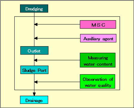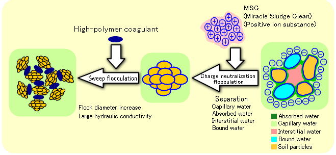 Special feature and effectMSC destroys adsorption water film covering the fine particle's surface in soil particle that composes bottom sediment. It is excellent in hydrophobization that releases a large quantity of free water in the soil particles. Hydrophobic fine particles absorb and combine each other. These particles become granulation and settle down quickly. After settling down, the whole gradually shrink and it exerts consolidation in accordance with increase of sediment volume. Consequently, water around soil particles is separated from soil particles and become pure supernatant water.1. Separated spill stream becomes supernatant water as soil particles agglutinate and settle down quickly. Particularly, the initial settling is fast 2. Increasing in hydrophobization and it is able to have space to store a large quantity of separated soil in treatment places due to large consolidation coefficient 3. We can quickly move to the second construction process because treatment places quickly dry out and coefficient of permeability is large 4. The safety tests proved its harmlessness to surrounding environment 5. Separated soil has effects as compost and soil improvement agents by MSC's component (iron, potassium, calcium) and nutrient salts (nitrogen, phosphorus) in bottom sediment and microorganisms. Thus, the separated soil is reused for agricultural soil 6. Not only hydrophobization of organic mud (sludge), but also MSC has an effect on flocking and settling of toxic substance in the contaminated water The process of bottom sediment