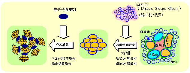 MSCは、疎水化脱水処理、土質改良剤として、浚渫底泥の沈降、圧密を早期に終了させるとともに、余水を清浄化します。底質汚泥の構造は、鉱物粒子の集合体で粗細粒子から成り立ち、粒子間の隙間部分は水と気体で満たされていて、この土粒子は通常負荷電をおびています。ここに、MSCを添加すると、MSCは陽イオン物質のために土粒子の負電荷と電気的に中和します。この際、土粒子を相互に結合していた毛管水が切り離され、間隙水、吸着水膜は自由水となる疎水化現象により、土粒子は、互いに吸着し粒径が大きくなり沈降します。さらに高分子凝集剤を添加すると、フロック径はさらに増大し、非常に大きな沈降速度を得ることができます。