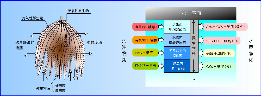 采用碳素纤维来净化水质,对环境没有负荷。是即经济(廉价)又有效果的方法。 通过碳素纤维具有的高度生物亲和性,形成活性生物膜,利用微生物的功能,分解污染物质。 并且,碳素纤维能够激发微生物活性化,招引鱼类,作为产卵和幼鱼的养育环境的藻场发挥其机能。