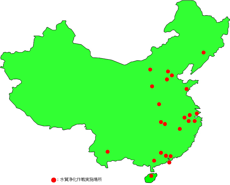 中国各地にて行われた水質浄化作戦の概要です。この他、様々な水域にて水質浄化活動が行われています。一部計画中のプロジェクトを含みます。
