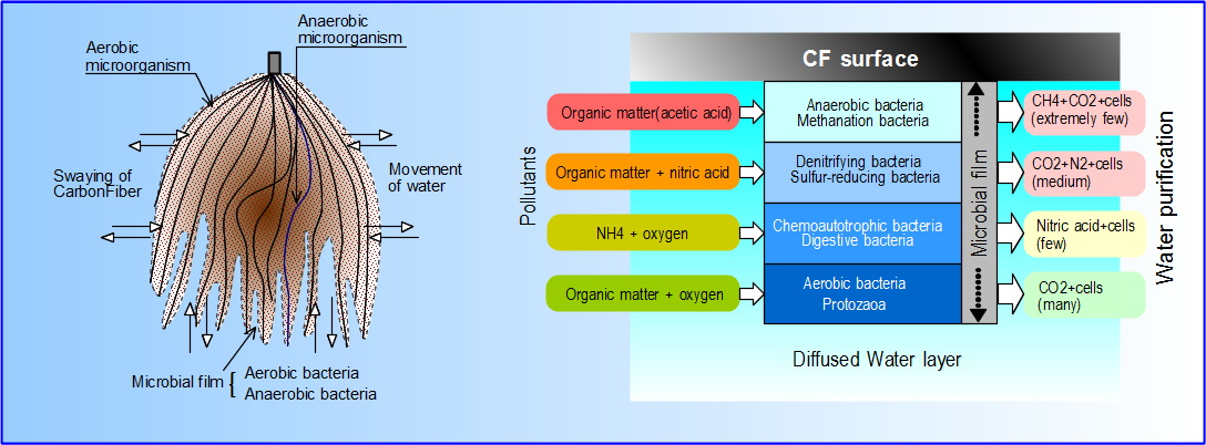 Water quality purification using CarbonFiber is effective in improvement of transparency in a short time, decrease COD and BOD, and purification of TN and TP.