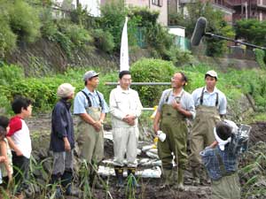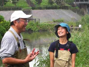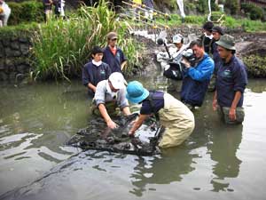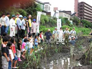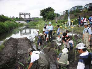 地区的人们和孩子们制造水湾通过碳素纤维水质净化工法变干净的水流入制造的水湾,植入植物,并放流了在生态系统调查中捕获的鱼类。
