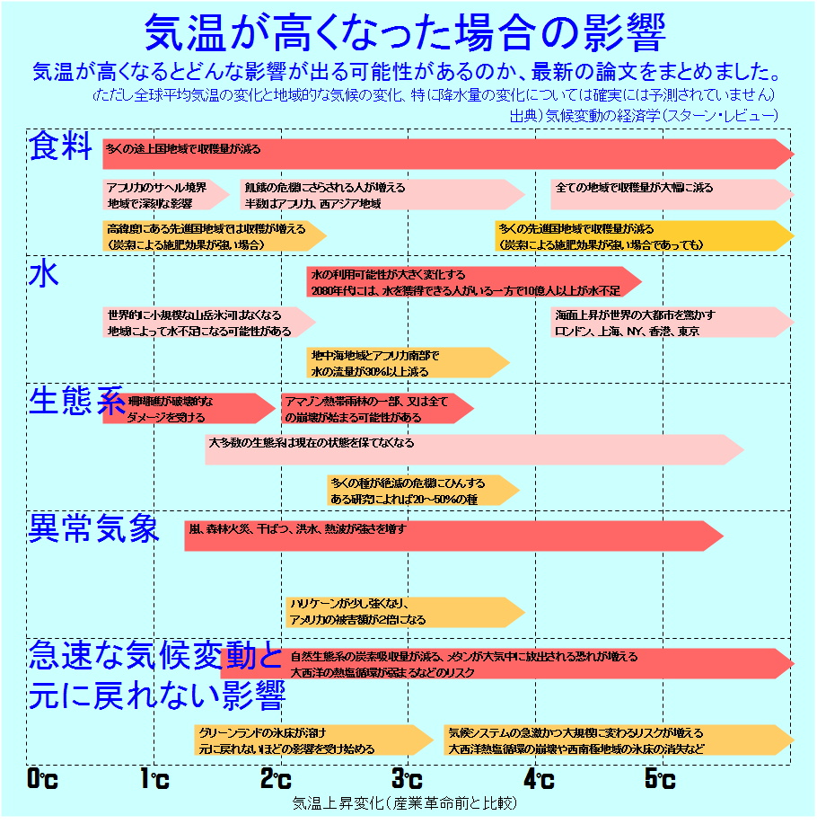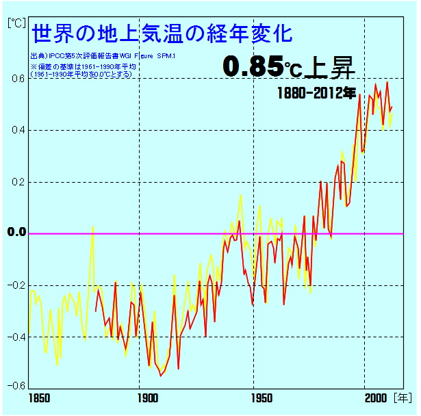 地球気温の上昇が、私たちの生活にどのような影響があるのか、直接的には解りづらいものです。しかし、近年の猛暑・酷暑と言われた年でも、平均気温にすると平年より約1~2℃程度高かっただけなので、僅かな気温上昇が生活に大きな影響を与えることが解ります。平均気温の上昇は、夏の熱中症の患者増加の原因となり、極端に少雨の年と多雨の年が出現し、地域的にも大洪水と干ばつ被害として2極化となり、近年、日本においても時間雨量100ミリ以上の豪雨の回数が増加し、河川氾濫や土砂崩れなどの被害が多発しています。豪雨の原因となる台風は、赤道付近の海水温上昇により強大な台風が発生しやすくなり、巨大台風は豪雨や強風はもちろん、高潮による被害も懸念されます。