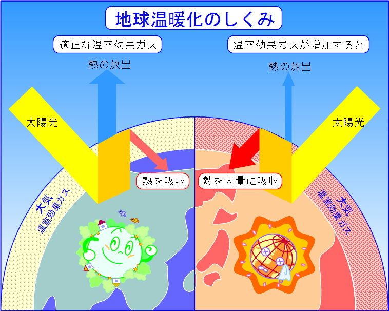地球温暖化とは、地球気温が温かくなること:温暖化する現象を言います。地球気温を調整する機能を持つ大気は、地表面から放射される熱を吸収し、地表面に再放射して、地球平均気温を14℃程度に保つ大きな役割を果たしています。この主な働きをするのが大気中の二酸化炭素等の気体で、温室効果ガスと呼ばれます。もし、この温室効果ガスがなければ、地球の平均気温は−19℃程度となり、地球は凍り付いてしまいます。地球気温は、温室効果ガスが大気中にバランス良く存在することにより、安定しているのです。