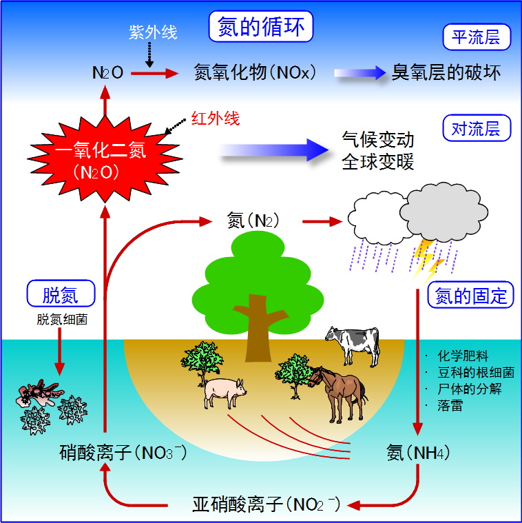 ●一氧化二氮(N2O) 一氧化二氮也称氧化亚氮,是氮氧化物的一种,主要发生源有燃烧、氮肥料的使用、化学工业(硝酸等的制造)、有机物的微生物分解、污泥中硝酸或亚硝酸的蓄积等。在地球的氮循环过程中,氨氮会被硝化成硝酸和亚硝酸,如果脱氮菌迅速将氮分解的话是不会产生的,但不存在脱氮菌的情况下就会产生。一氧化二氮具有较大温室效果,是二氧化碳的约300倍,大气中的一氧化二氮浓度自1750年以后增加了17%,现在也正继续增加。