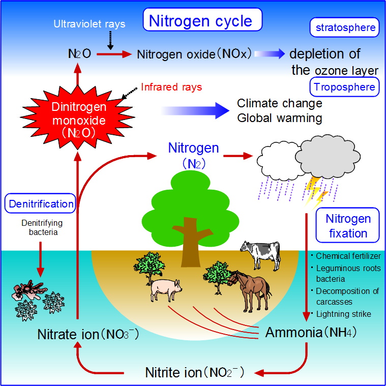 ●Dinitrogen monoxide(N2O) Dinitrogen monoxide is also reffered to as nitrogen oxide. The main sources are combustion,the use of nitrogen fertilizer,chemical industry(manufacturing nitric acid),organic microbial degradation of nitric acid in the sludge, and nitrite accumulation. In the process of nitrogen circulation, ammonia becomes nitrogen and nitric acid degraded by the denitrifying bacteria. Dinitrogen monoxide occurs when there is no denitrifying bacteria. Dinitrogen monoxide a gas with a large greenhouse gas effect of about 300 times that of carbon dioxide. Dinitrogen monoxide concentration on the atmosphere has increased to 17% since the year 1750, and still increasing.