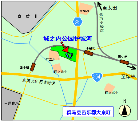 城之内公园位于市区北侧,是整备着小泉城遗迹的群马县内为数不多的城址公园。城的形态是由平原城堡,主城堡和土垒、第三城堡的一部份的护城河和土垒保持良好形状的城遗迹。主城堡护城河约4000㎡,周围道旁有樱树,一年四季成为镇民的休息的场所。