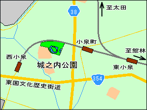 城之内公園は市街地の北側に位置し、小泉城跡を整備した群馬県内有数の城址公園です。城の形態は、平城で本丸の水堀と土塁、三の丸の一部の水堀と土塁が良好な形をとどめる城跡です。本丸水堀は約4000u、周囲に桜の並木があり、四季を通じて町民の憩いの場所となっています。