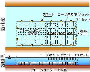 炭素繊維水質浄化材:フレームユニット 24基 (平成20年度設置)、 プロジェクトの成果 簡易隔離シート、水面上に炭素繊維水質浄化材を設置(半面)したことにより、透視度、CODの向上が確認でき、一定の水質浄化効果は確認できました。