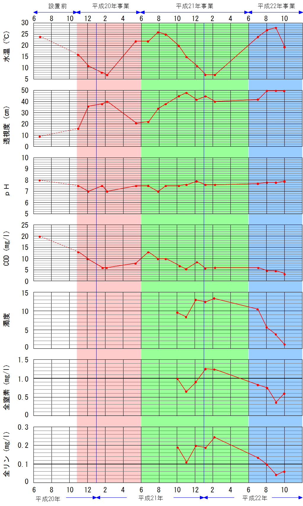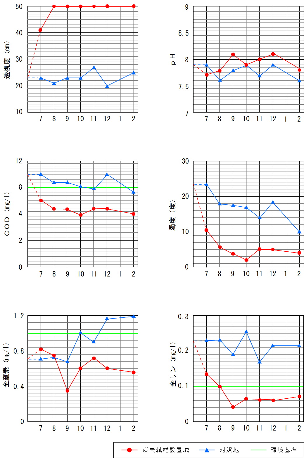 水中より浮遊懸濁物質が、炭素繊維に吸着除去されたことにより透視度は上がり、濁度は大きく低下しました。さらに全窒素、全リンなど栄養塩類の低下によりアオコ・藻類の発生が抑制され、CODの低下は有機物の分解除去を示し、水域内の水質浄化が進んだことが示されました。