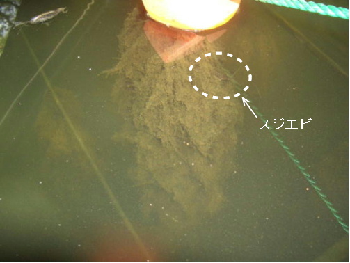 実証域内では、炭素繊維周辺や隔離シート面にスジエビの群生が観られ、他にも小魚など多くの水生生物が生息していることが観察できます。炭素繊維表面の顕微鏡観察では、多くの吸着汚濁物質や微生物の分解産物の他に、藻類や動物プランクトン等の微生物が観られることから、スジエビや小魚類は、炭素繊維に付着したそれら微生物を捕食するため炭素繊維の周辺に多く集まっていると思われます。炭素繊維による水質浄化効果に伴い、大小様々な水生生物が集まり、豊かな生態系が形成されています。