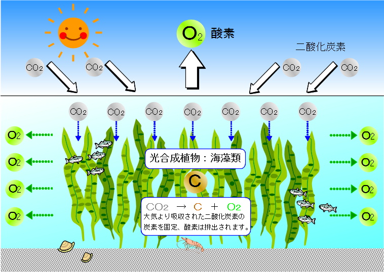 ★CO2吸収による地球温暖化防止 海洋における一次生産を支える海藻類などの光合成は、二酸化炭素CO2を吸収し、酸素O2を 排出します。CO2は、近年地球規模での環境破壊といわれる地球温暖化の原因物質として削 減が求められています。海藻類が繁殖し旺盛に光合成を行えば、CO2を大量に吸収するため、 地球の温暖化を防ぐ有効な手段となりますが、海藻類が減少すればCO2は減少せず、温暖化 が加速してしまいます。海洋の一次生産量は、熱帯雨林にも匹敵すると言われるため、海藻類 が繁殖する浅い海の環境を保全することは、非常に有効な地球温暖化防止対策となるのです。 海の森づくりは、海洋の環境改善だけでなく、温暖化防止など地球規模での環境保全に貢献します。