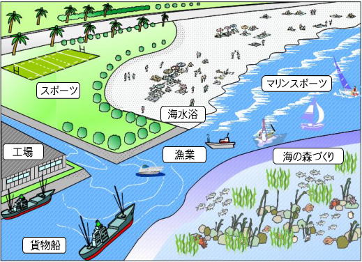 しかし、近年の急激な経済発展と産業活動は、この浅い海の環境を犠牲にし、藻場が激減するなど環境破壊を進行させています。 二十世紀における先進国の高度成長によって引き起こされた劣悪な海洋汚染は、突発的事故を除き改善の方向に向かっています。しかし、全ての排水が、最終的に海洋に流出することから根源的には解決されていません。また、アジアやアフリカなどの途上国において、経済発展が顕著となり、工業生産量とともに汚染物質排出量が増大することにより、地球規模での海洋汚染は拡大しています。 沿岸地域では、都市開発や防災工事のため埋め立てや浚渫が継続的に施工され、都市部の沿岸海域には、あっという間に人工構造物が建造されます。都市開発や埋め立てをまぬがれた内湾の漁場は、過密養殖などで環境悪化の一途で、かつての好漁場は、海藻類の枯れ死により「磯焼け」と言われる状態となり、それによって、生息するアワビやウニ、磯付き魚などの収穫が激減しています。 一方、私たちの豊かな生活から、大量の窒素やリンが継続的に排出され、海域における生態系バランスを崩しています。富栄養化現象を引き起こし、植物プランクトンが大増殖をして「赤潮」を発生させています。さらに、海底が無酸素状態になると、酸素の含有量が極端に少ない貧酸素水塊ができ、夏季に海面上に移動し「青潮」を発生させます。富栄養化はヒトデやクラゲなどの大量発生を招き、海藻類や珊瑚などにダメージを与え、赤潮や青潮の発生により、さらに浅い海の環境は破壊され「磯焼け」が拡大します。