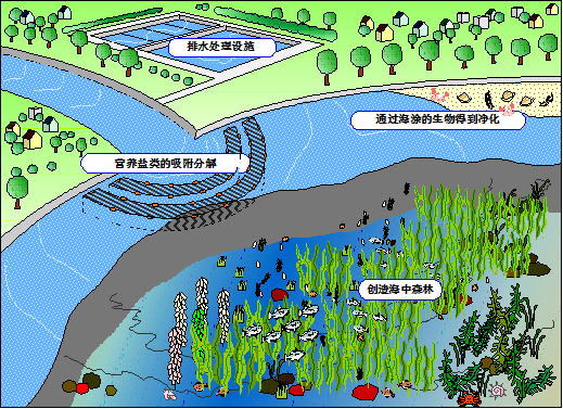 藻类再生计划海岸枯竭和赤潮、青潮等海洋环境被破坏的原因是因为我们人类的富裕的生活,我们在维持经济活动和产业活动的同时必须采取对策。最好的是抑制维持富裕生活的那些活动,不排放污染物。但是那是不现实的,我们要尽量减少污染物的排出,并且通过提高环境技术,降低环境负荷也是很重要的。虽然在日本等发达国家通过法制法规的强化、环境技术的进步已经有对策。但是,过去发生的环境污染已经破坏了自然界的生态平衡,失去自然净化的能力,到了不可挽回的状态。排放量的消减和内陆部的对策是有限的,失去的自然环境一去不返。要恢复环境需要直接在海域进行有效的对策。 在海岸枯竭的对策上需要繁殖海藻类,让海藻和海草等海中的森林死而复生。如果海里有繁殖海藻的海中森林,海藻会把营养盐类作为营养而吸收,抑制赤潮的发生。无氧状态的海底通过海藻的光合作用获取氧气,抑制青潮的发生。 通过创造海中森林,强化并补充大海原有的自然净化能力,激活基础生产,根据这个物理循环性水质被净化,就可以创造资源丰富的海洋。