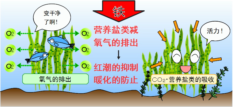 海藻类的成长需要氮和磷,硅等成为肥料的营养素。被污染的海水里有大量的氮和磷,容易被误认为营养丰富,其实,海水中的氮是氮硝酸盐NO3-,磷是磷酸盐PO4-形式溶化着,就这样是不会成为海藻的养分的。要变成为养分,还原需要还原到氮N和磷P的形式。所谓还原,是和酸化相反要把氧气的O除去,这需要金属铁离子Fe+的配合。