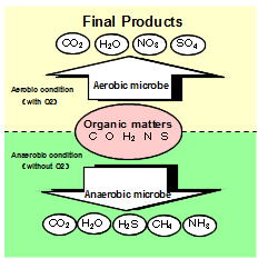 ¡¡Under anaerobic conditions, decomposition proceeds in reduction, and organic matter is decomposed to methane and carbon dioxide. Anaerobic treatment which doesn't need air is energy-saving manner because it enables to use the generated methane gas. However there is also a disadvantage. Device size is large, and it requires long residence time because of the reaction rate is slow and odorous emission.¡¡