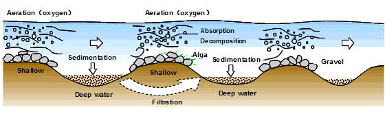 ¡¡In rivers, solid matters and soluble substances are reduced or changed by dilution, sedimentation, filtration, bed load, adsorption, decomposition and oxidation due to river channel shape, flow condition, and various living things. Rivers have self-cleaning effect of these mechanisms.