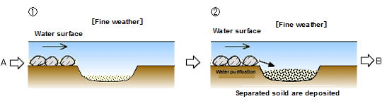 ¡¡By the river self purification, oxidized, adsorpted, and absorpted substances are compressed and deposited on the riverbed as peeled off or sludge by the flow rate. Deposited sludge is bed load flow rate by very fast when it flood, then purification function of the river will be restored.