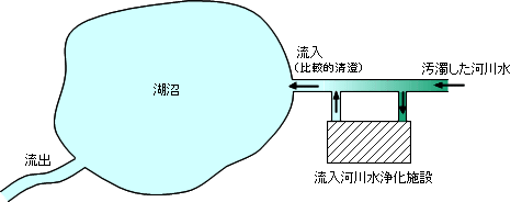 このうち、窒素、リン等の栄養塩類については流域から排出されてくるので、流域対策あるいは湖沼流入河川対策など湖沼に流入する前に除去するのが有効です。